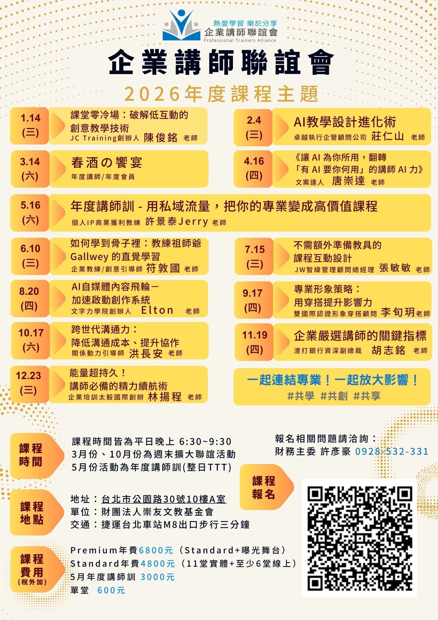 【獲得企業講師聯誼會的最新消息】 加入「企業講師聯誼會會員交流社群」活動訊息的 Line 群組 請點選開啟 Line 歡迎加入「企業講師聯誼會」臉書社團 點選前往 Facebook 前往 Google 表單,填寫年度會員報名資料。 請點選,開啟 Google 表單